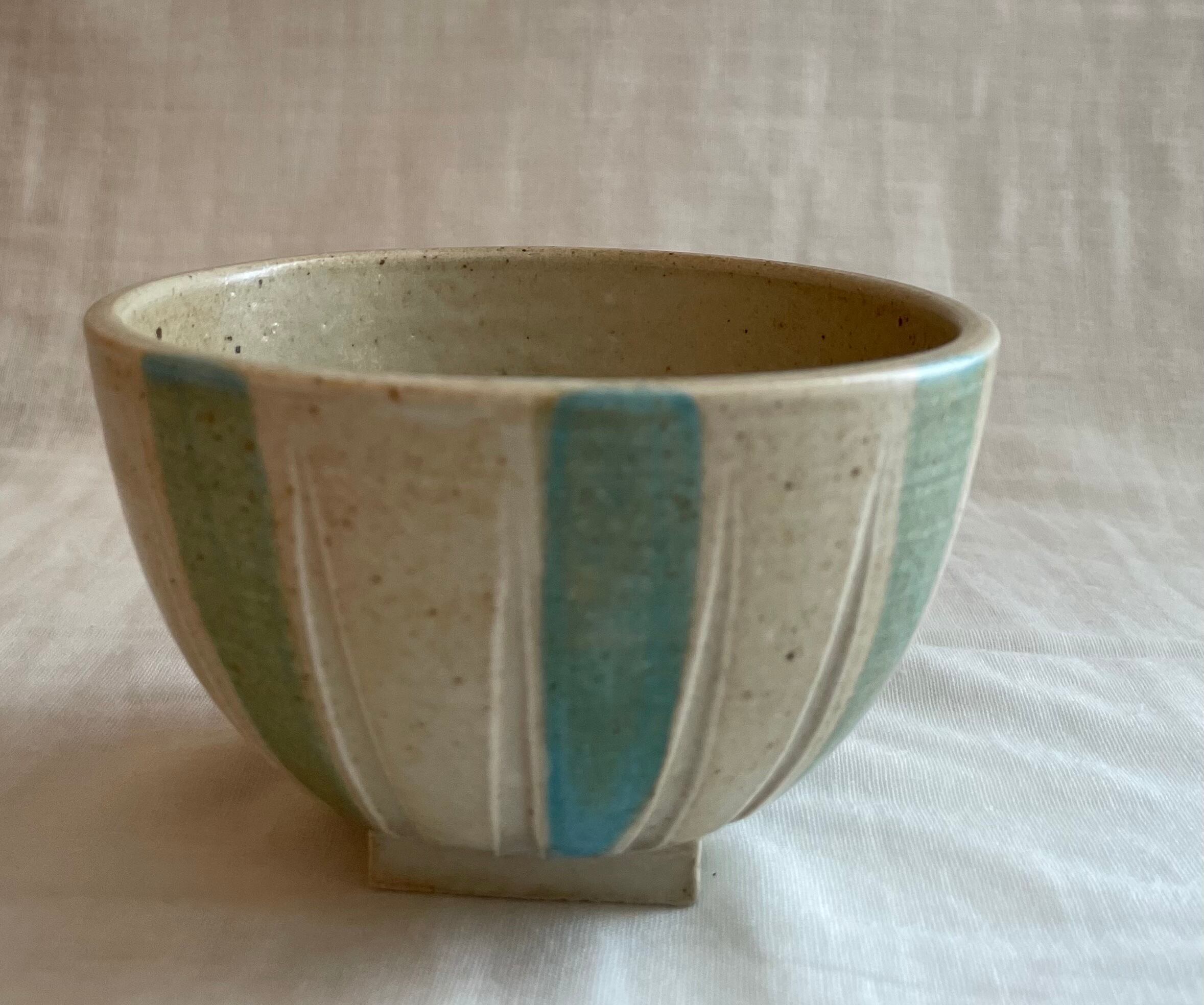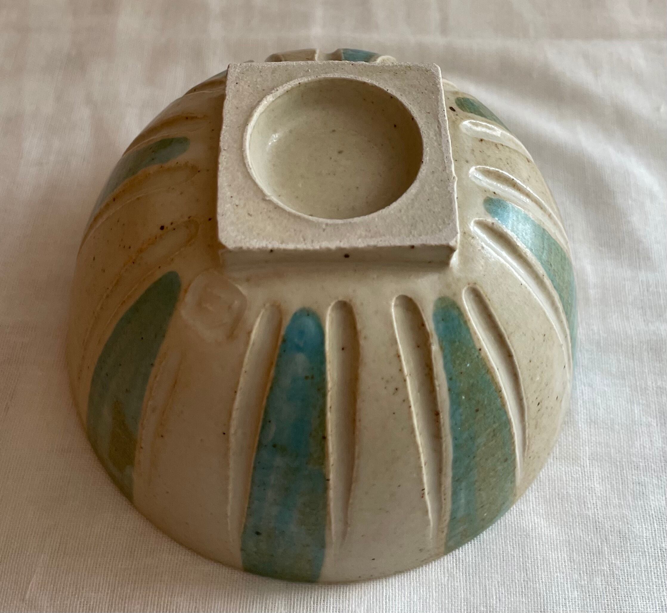 水色のストライプと彫りが入った可愛いボウルになります。こちらは、底が四角で存在感がある商品です。実際のお色になるべく近くなるように調整しておりますが実物は若干、もう少し明るめです。